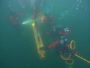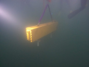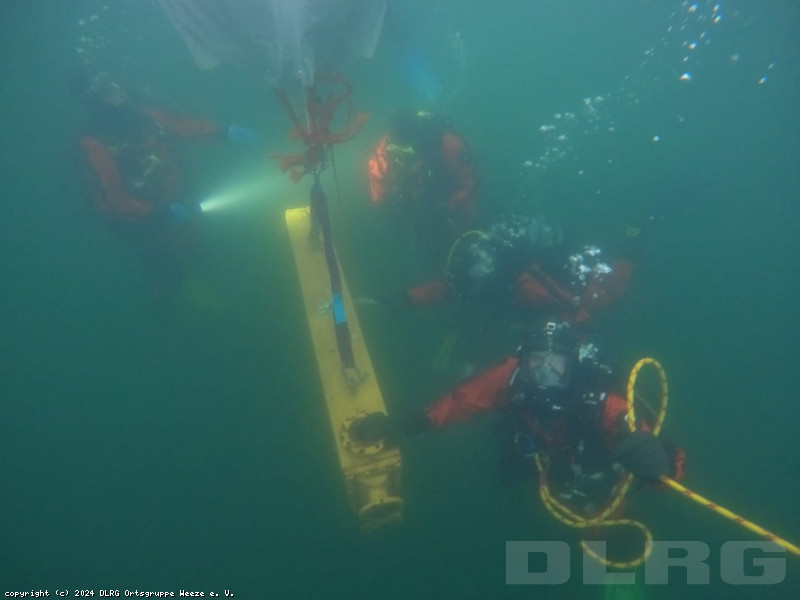 Und wenn die Taucher schon einmal im Wasser sind, haben wir die Chance direkt auch genutzt, einen ehemaligen Wärmetauscher zu versenken. Dieser wurde mit Hilfe von sogenannten Hebesäcken kontrolliert zum Grund des See's herab gelassen. An dem Wärmetauscher können wir dann zukünftig das Arbeiten unter Wasser, sowie das Heben von Lasten üben.
