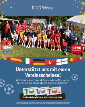 Diesen könnt ihr in der Rewe App oder unter rewe.de/scheinfürvereine einlösen und der DLRG Weeze zuordnen. Das geht von überall, in ganz Deutschland, egal in welchem Rewe Markt ihr die Scheine gesammelt habt.